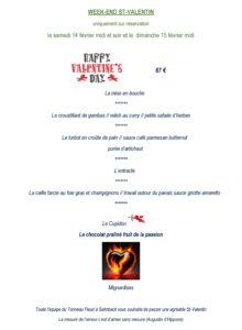 Dernière actualité MENU SAINT VALENTIN - SOIREE OENOELOGIE - OFFRE D'APPRENTISSAGE SALLE ET CUISINE - EXTRA EN SALLE DIMANCHE MIDI